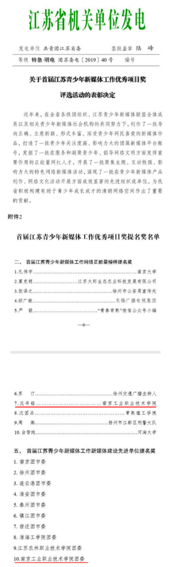 本次活动于2019年1月启动,经各系统各单位推报、专家评审、省级现场答辩和网络公示等环节,计算机与软件学院网络1611班沈书铭同学获“首届江苏青少年新媒体工作网络正能量榜样提名奖”(全省唯一高职院校),校团委获“首届江苏青少年新媒体工作新媒体建设先进单位提名奖”(全省仅3所高校)。
