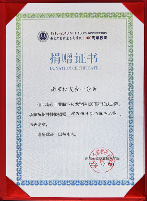 吴书记代表学校校友总会向南京校友会一分会颁发了捐赠证书。他在致辞中对南京校友会一分会的筹备组织工作表示充分的肯定,对300多位老校友的捐赠表达了崇高的敬意,并嘱托校友总会秘书处一定要安排好老校友返校接待工作,并向袁秘书长一行介绍了近年来学校的办学成果和发展情况。他指出,百余年风雨沧桑,培育出万千栋梁,母校今天所取得的成绩,与广大老校友对学校无私的关心、支持和帮助是密不可分的,300多位老校友表达的这份真情,充分彰显校友组织的向心力、凝聚力和号召力,老校友心系母校、感恩母校、回馈母校的善举进一步诠释了“敬业乐群”的校训精神,为南工院的百年华诞再献厚礼。