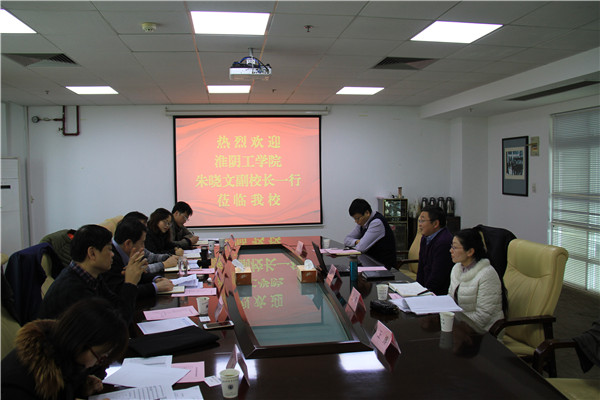 3月5日下午,淮阴工学院朱晓文副校长率领相关部门负责同志来必赢官网进行工作交流。必赢官网朱建国副校长以及人事处、教务处、科技处等部门负责同志接待了来宾。