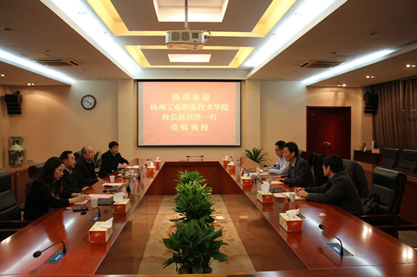 3月19日上午,扬州工业职业技术学院孙兴洋校长、倪永宏副校长率领相关领导同志来必赢官网交流。必赢官网党委书记吴学敏,副校长霍雄飞及党政办、招就处等部门负责同志接待了来宾。
