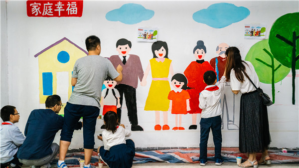 活动前,党总支副书记高原组织志愿者们召开了活动筹备工作会,制定了墙绘方案,明确了具体分工。活动当天,志愿者们带领来自金陵小学的40多位学生和家长,利用仙林湖社区空置的墙面,精心绘制了“家庭幸福”、“邻里和谐”、“祖国富强”、“青山绿水”四幅墙绘,将社会主义核心价值观和“中国梦”精神融入其中,为新中国成立70周年献礼。