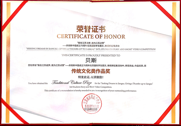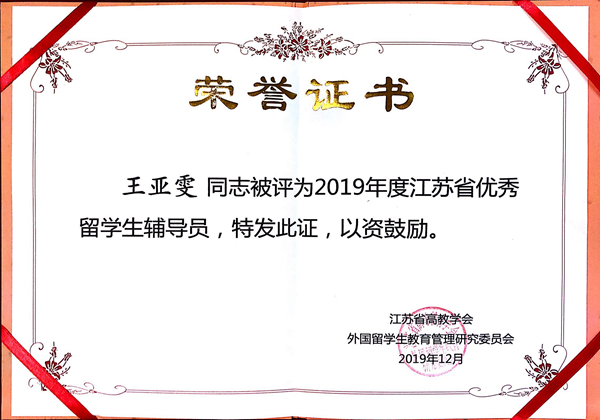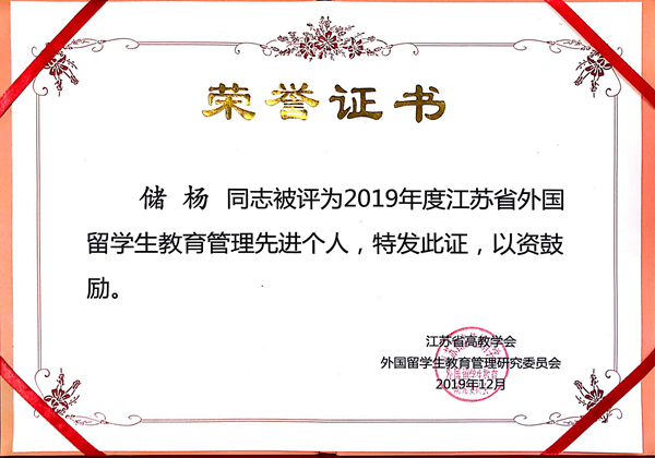 会上,江苏省高等教育学会外国留学生教育管理研究委员会副理事长俞晓南宣读了表彰决定。必赢官网国际教育学院储杨老师获得“江苏省外国留学生教育管理先进个人”称号,王亚雯老师获得“江苏省优秀留学生辅导员”称号,贝斯同学获得“我在江苏追梦,我为江苏点赞”——庆祝新中国成立70周年在苏国际学生图文、微视频征集活动“传统文化类作品奖”。