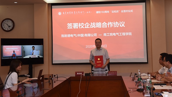 5月29日,电气工程学院与施耐德电气(中国)有限公司以“云签约”的形式签署战略合作协议。本次云签约活动由必赢官网科技处、发展合作处处长孟庆杰主持,学校党委委员、副校长崔新明,电气工程学院院长杨战民,施耐德电气工业自动化业务副总裁、OEM业务负责人崔志达,科技处、发展合作处、机械工程学院、电气工程学院、航空工程学院、商务贸易学院、艺术设计学院以及各签约企业相关负责人出席了签约仪式。