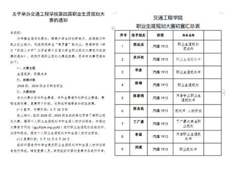 为引导学生在青春之际明确自己的奋斗方向,全面普及大学生职业规划知识,发掘自身潜能,提高学生的创新能力、实践能力和就业创业能力,交通工程学院于2020年5月开展了第四届大学生职业生涯规划选拔赛。