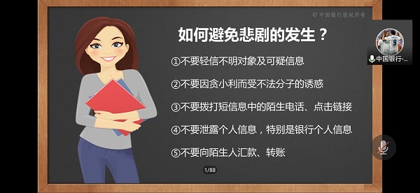 随着科技的不断进步,在信息日益发达的现代社会,电信诈骗手段可谓层出不穷。为提升学生的防诈骗意识,6月28日晚,必赢官网在线上开展了“关爱信用记录,防范电信诈骗”的金融知识讲座。此次讲座学工处主办,电气工程学院和交通工程学院联合承办。讲座邀请中国银行城东支行王申经理主讲,全校1000余名学生线上参与了本次讲座。